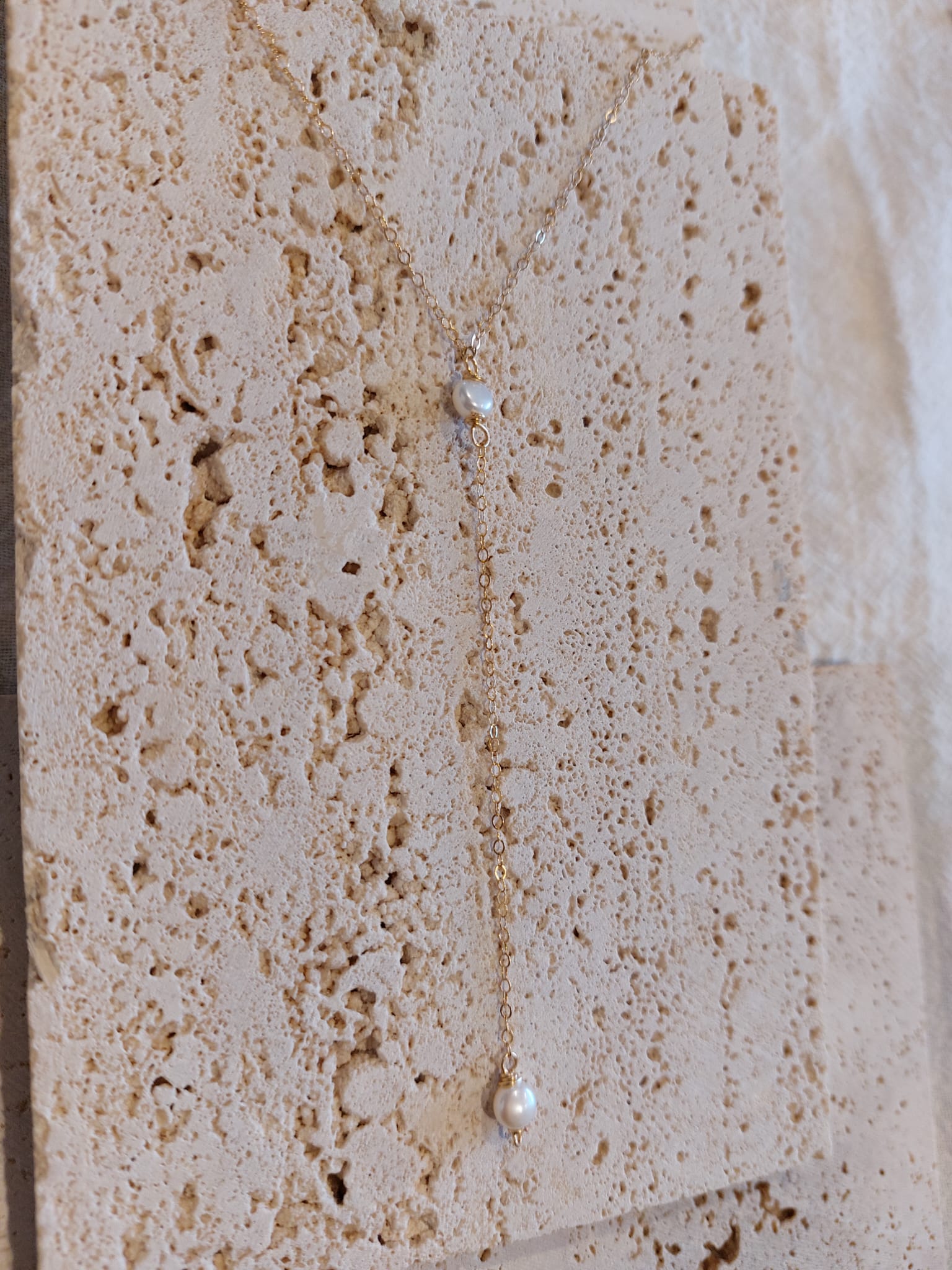 Our beautiful new Lariat Necklace as part of our winter collection features two seed freshwater pearls on a 14 carat gold chain.