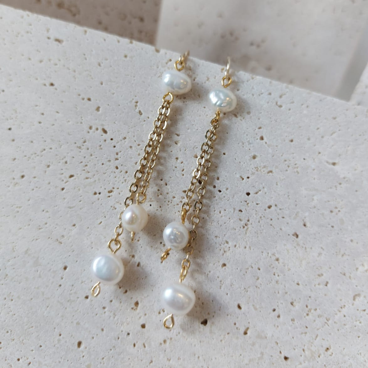 Add a touch of elegance to any outfit with our Iris Drop Earrings. These dainty earrings feature three freshwater potato pearls that will catch the eye with their timeless beauty. Perfect for any occasion, these dangly earrings are an essential addition to your jewelry collection.