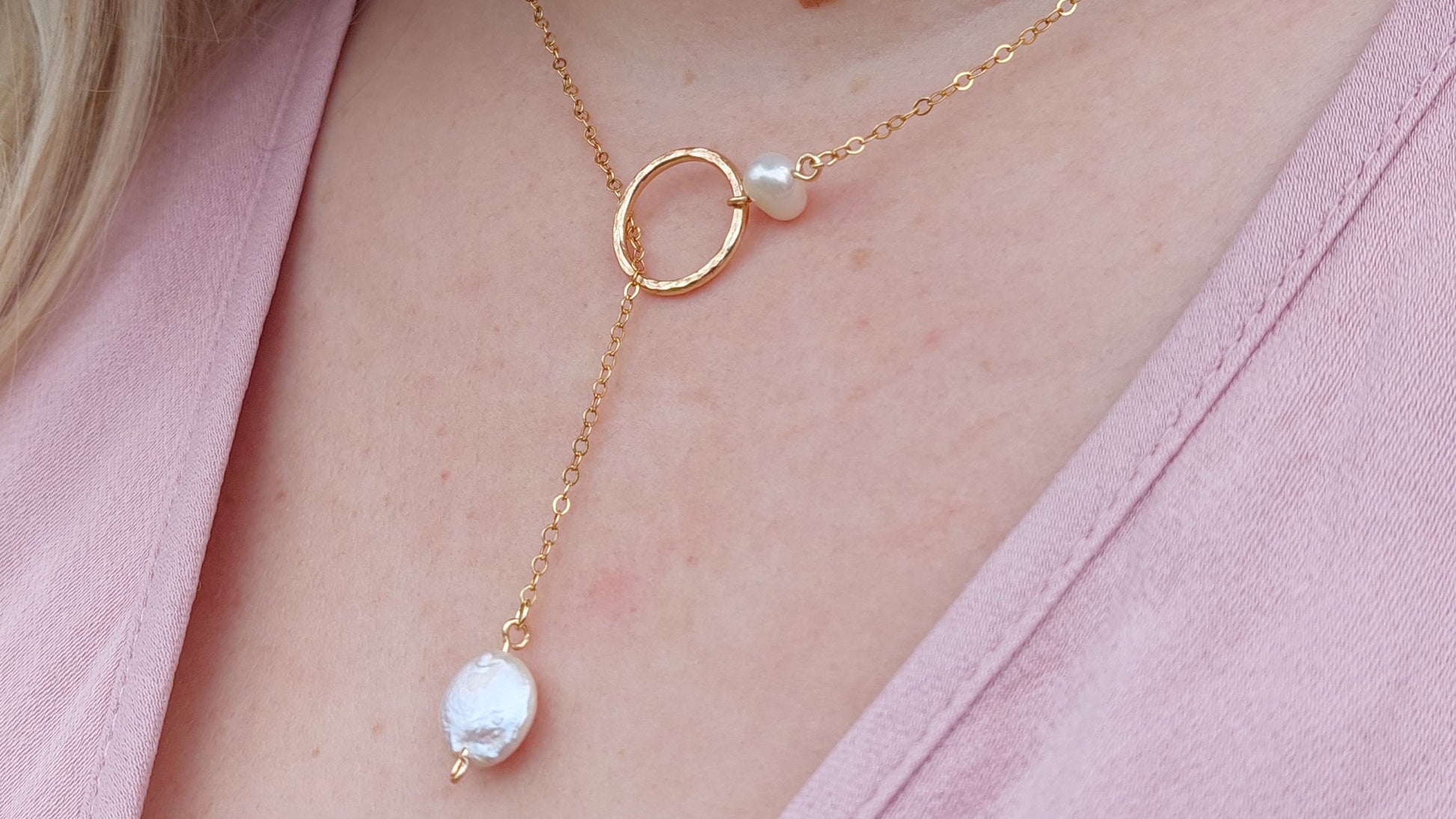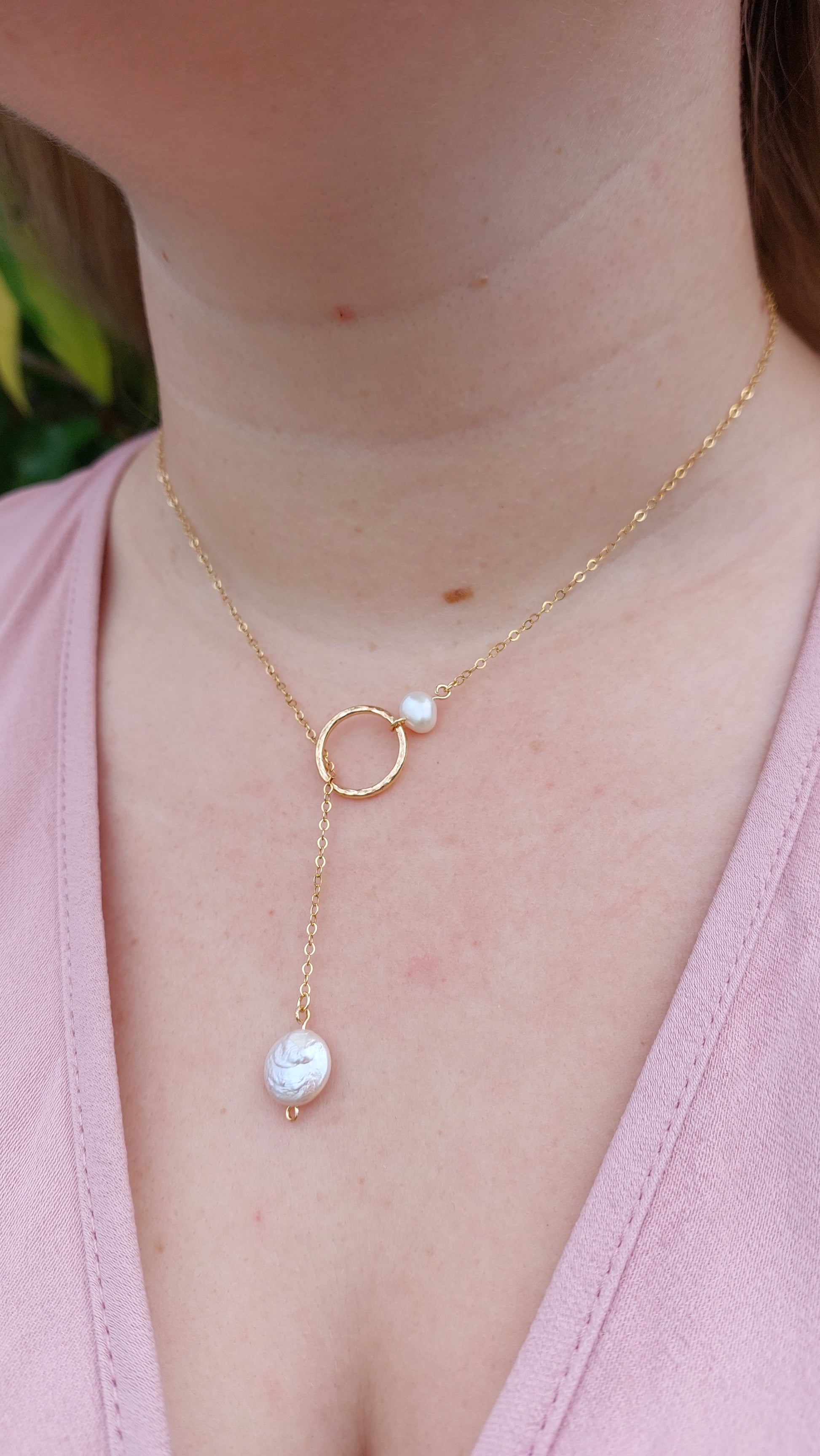 Elevate your style with our one-of-a-kind Maya Lariat Necklace. A lavish coin pearl and a freshwater baroque pearl come together on a 14k gold-filled chain, creating a stunning combination. Simply loop the coin pearl through the hammered gold-filled link for an elegant lariat necklace. This accessory is both chic and playful, the perfect addition to any outfit.